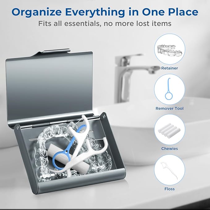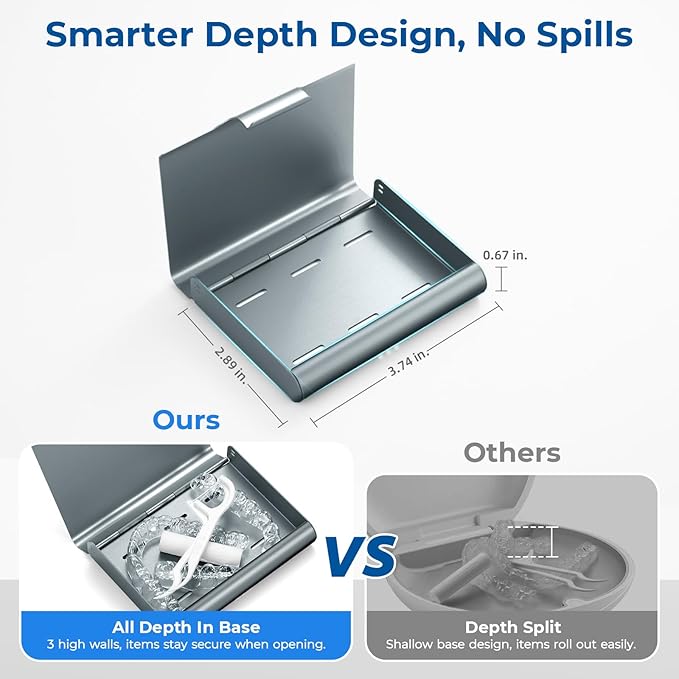 - Secure Closure & Anti-Spill Design: Features mechanical clasp snaps firmly flush against the denture container, locking your aligners securely inside—no magnet failures that cause accidental spills. All depth in base with 3 high walls prevent aligner from sliding out when opened (unlike shallow base design). Precision-polished edges won’t scratch belongings in your bag. Hinges are reinforced aluminum, eliminating plastic breakage points. Guarantees your appliance stays fixed and protected.