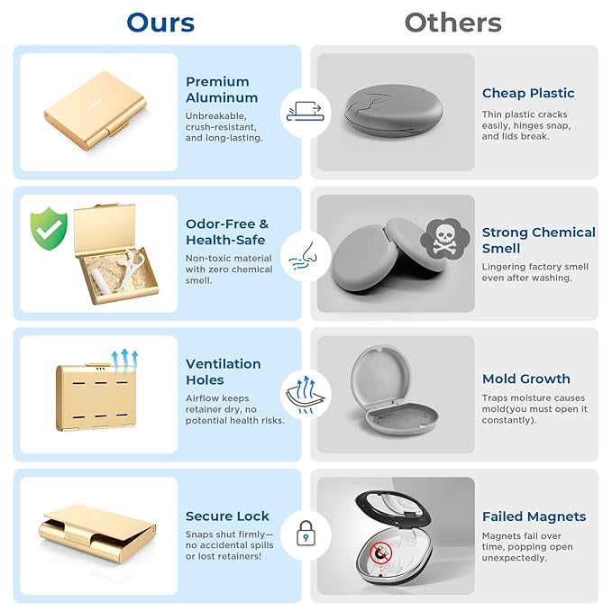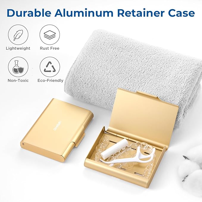 - High-Quality Material: Made of durable aluminum alloy, Oralphi retainer case is naturally non-toxic, odorless, and rustproof. Unlike ordinary fragile plastic denture case that leach chemicals and develop foul smells, our metal construction withstands crushing forces and will not crack after long-term use, protecting your orthodontic accessories or retainers stay pristine and safe. Experience lasting hygiene and peace of mind—no more chemical tastes or worrying about degradation over time.