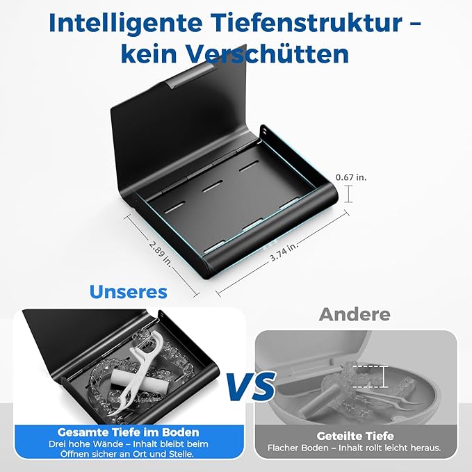 - Secure Closure & Anti-Spill Design: Features mechanical clasp snaps firmly flush against the denture container, locking your aligners securely inside—no magnet failures that cause accidental spills. All depth in base with 3 high walls prevent aligner from sliding out when opened (unlike shallow base design). Precision-polished edges won’t scratch belongings in your bag. Hinges are reinforced aluminum, eliminating plastic breakage points. Guarantees your appliance stays fixed and protected.