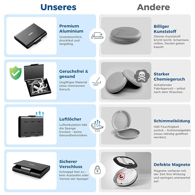 - High-Quality Material: Made of durable aluminum alloy, Oralphi retainer case is naturally non-toxic, odorless, and rustproof. Unlike ordinary fragile plastic denture case that leach chemicals and develop foul smells, our metal construction withstands crushing forces and will not crack after long-term use, protecting your orthodontic accessories or retainers stay pristine and safe. Experience lasting hygiene and peace of mind—no more chemical tastes or worrying about degradation over time.