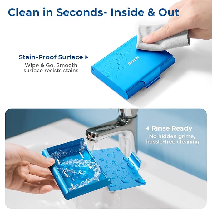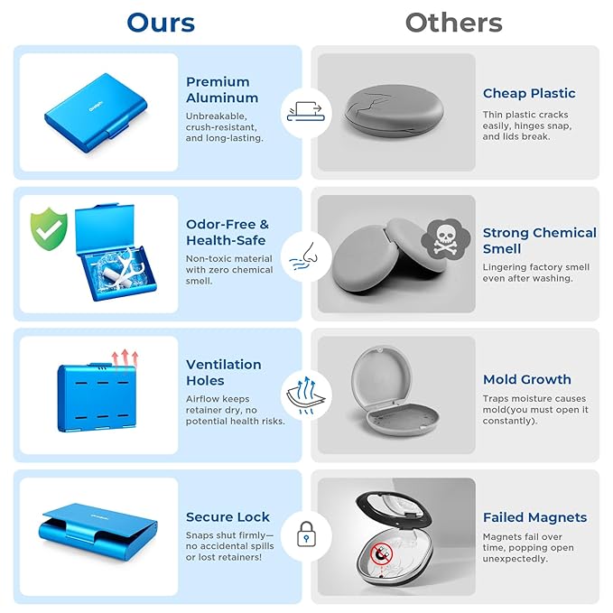 - High-Quality Material: Made of durable aluminum alloy, Oralphi retainer case is naturally non-toxic, odorless, and rustproof. Unlike ordinary fragile plastic denture case that leach chemicals and develop foul smells, our metal construction withstands crushing forces and will not crack after long-term use, protecting your orthodontic accessories or retainers stay pristine and safe. Experience lasting hygiene and peace of mind—no more chemical tastes or worrying about degradation over time.