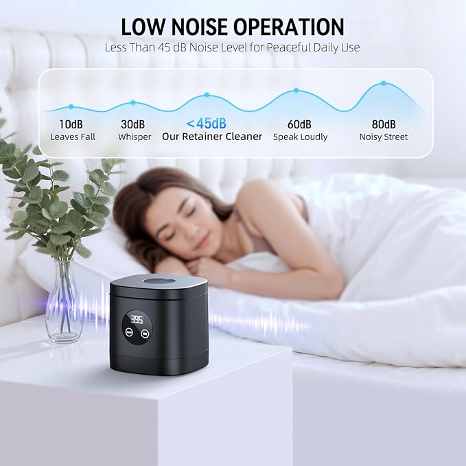 - 【Under 45dB Low Noise & Anti-slip Bottom Design】The retainer cleaner runs quietly below 45dB, offering a quiet cleaning experience without disturbing your surroundings. The bottom is equipped with four pieces of non-slip rubber, which is easy to stabilize the retainer cleaner ultrasonic, effectively reduce noise and make it safer to use. ultra sonic retainer cleaner machine.