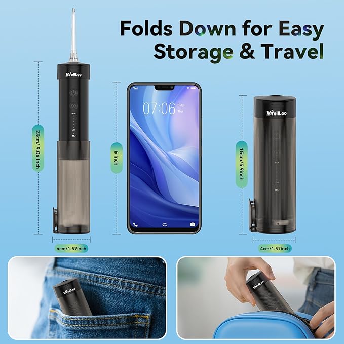 - Designed for Travel and Ultra-Compact with Storage Bag:This mini water flosser folds down to just 5.9 inches and features a 200ml collapsible tank—ideal for travel, business trips, or daily use. The water flosser cordless fits easily into pockets, makeup bags, or carry-ons, and includes a storage pouch to keep it clean and protected wherever you go