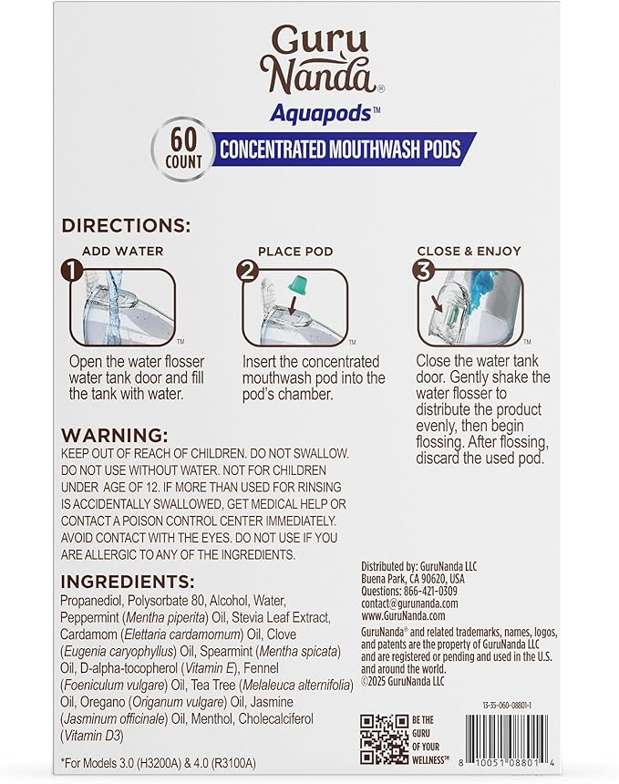 GuruNanda Aqua Pods Pre-Measured Concentrated Mouthwash for GuruNanda Water Flosser 4.0, Fluoride & Alcohol-Free, Wild Mint Flavor, Travel-Friendly, 60 Count