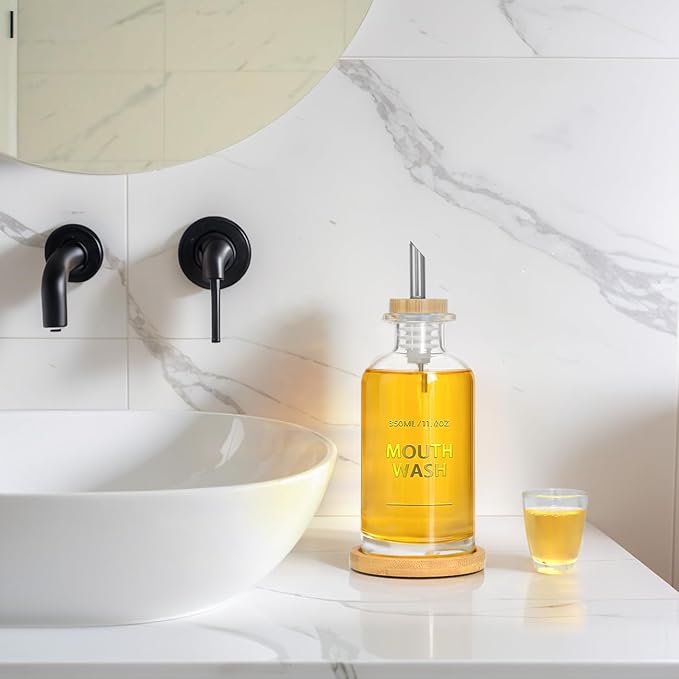 - Smooth-Pour Nozzle – Stainless Steel & Bamboo Elegance: This glass mouthwash dispenser with cup features a sleek pour nozzle combining stainless steel and bamboo—offering smooth, mess-free dispensing every time. Whether used as a modern mouthwash container for bathroom counters, a stylish mouthwash carafe, or a family-friendly dispenser, its refined design fits seamlessly into any bathroom accessories set. Ideal for guest bathrooms, or family use.