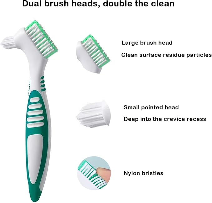 - Advanced Double-Headed Denture Cleaner Brushes: Each toothbrush for dentures features a dual-head design with multi-layered soft bristles. The large brush head removes surface debris, while the small pointed head cleans deep crevices, effectively protecting dentures from damage and maintaining oral hygiene