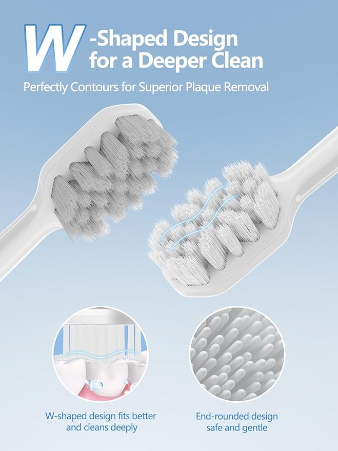 - 7+1 replacement brush heads for 2 YEARS - 7Magic electric toothbrush comes with 8 premium replacement brush heads (7 standard plus 1 deep-cleaning). The W-shaped bristle layout is engineered to conform to tooth contours, thoroughly cleaning the gumline and hard-to-reach areas. With each head lasting about 3 months, you have up to 24 months of use before needing new brush heads
