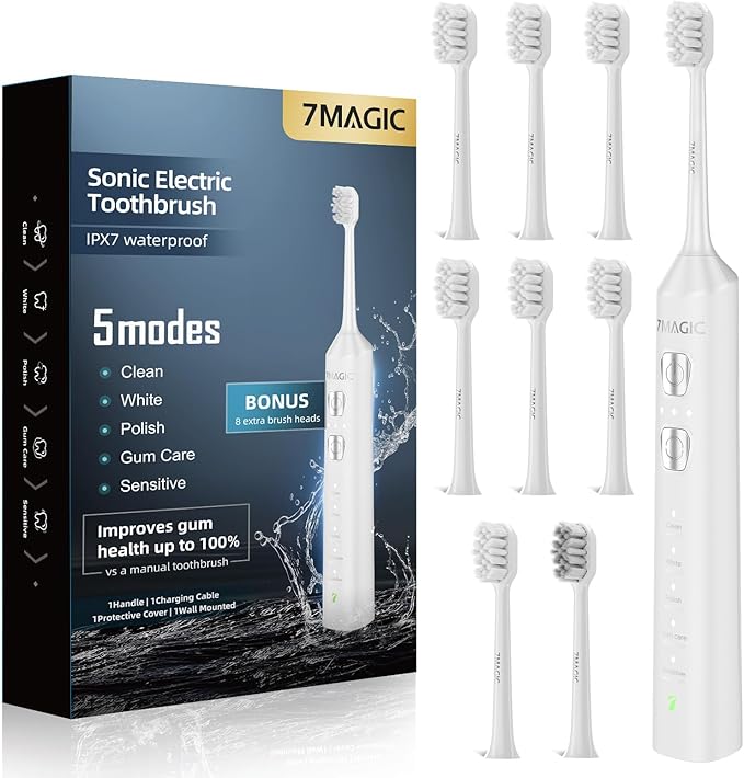 - What’s in the Box: Includes 7MAGIC Sonic Electric Toothbrush (White) ×1, Brush Heads ×8 (Standard Brush Head x7 + Deep-Cleaning Brush Head x1), USB Charging Cable ×1, User Manual ×1, Toothbrush Hanger ×1, Brush Head Cover ×1