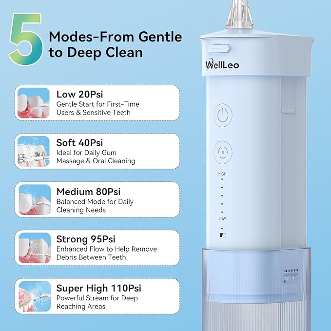 - 5 Cleaning Modes with Powerful Pressure and Smart Timer :The electric flosser Offers five cleaning modes ranging from gentle to powerful, whether you have sensitive gums, wear braces, or need a deep clean, there's a mode that fits your needs. The irrigador dental delivers strong water pressure for more effective plaque removal. The built-in smart timer automatically powers off after two minutes to help guide proper cleaning time
