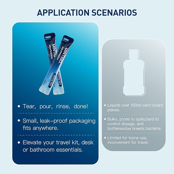 - Ultra-Portable Design: travel mouthwash strips are individually packaged into slim, travel-ready packets. Easily stash them in your pocket, purse, or luggage for instant fresh breath anytime, anywhere. It's a necessary travel essentials.