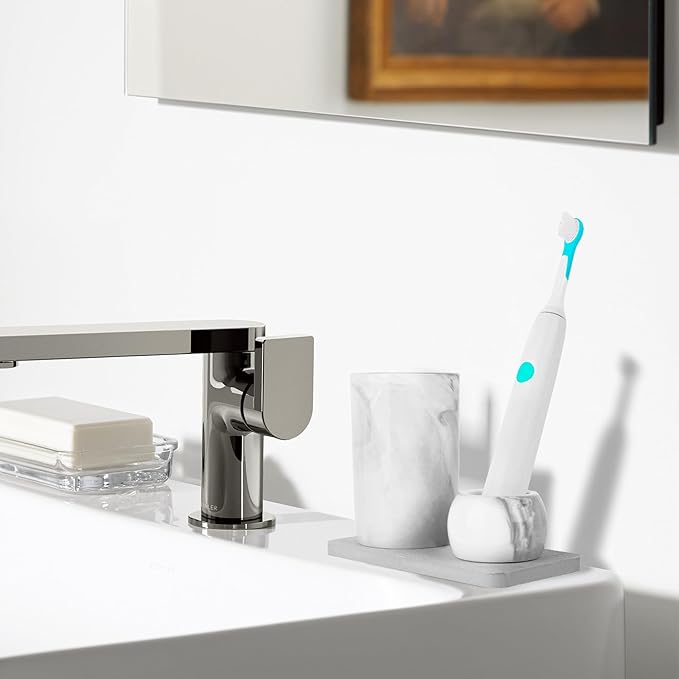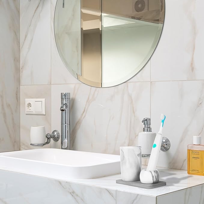 - Electric Toothbrush Holder features white marble-like design with slight gray / black streak in it and streamlined silhouette with a modern flair to the design of your bathroom.
