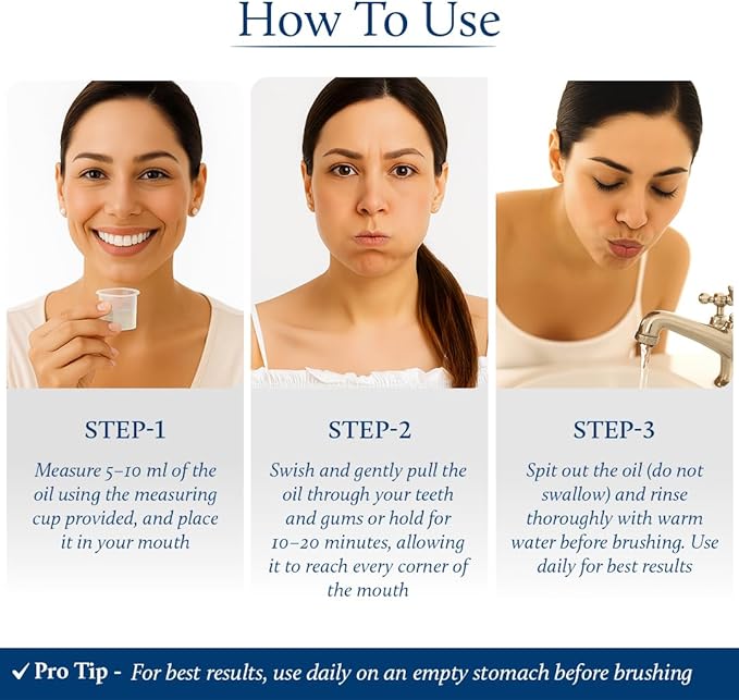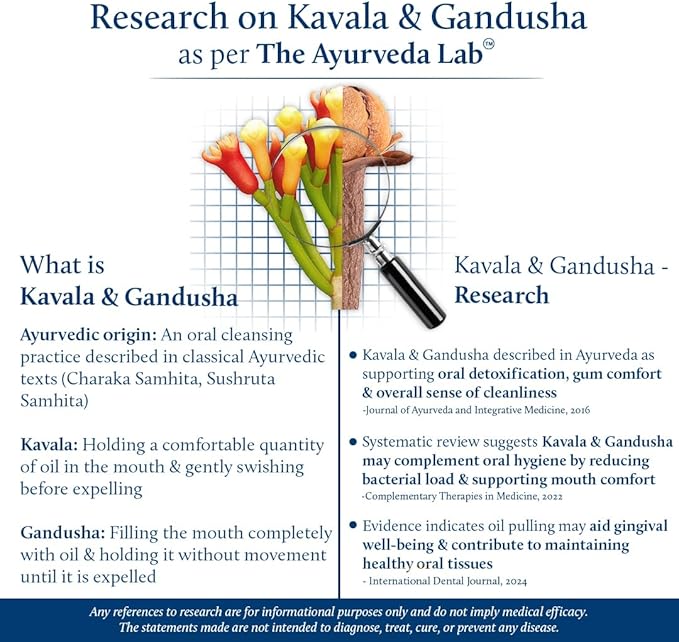 - Perfect for Kavala & Gandusha: For Kavala, swish 1 tbsp for 5β15 min of oil through teeth & gums before brushing. For Gandusha, keep 1-2 tbsp in mouth for 5-15min.