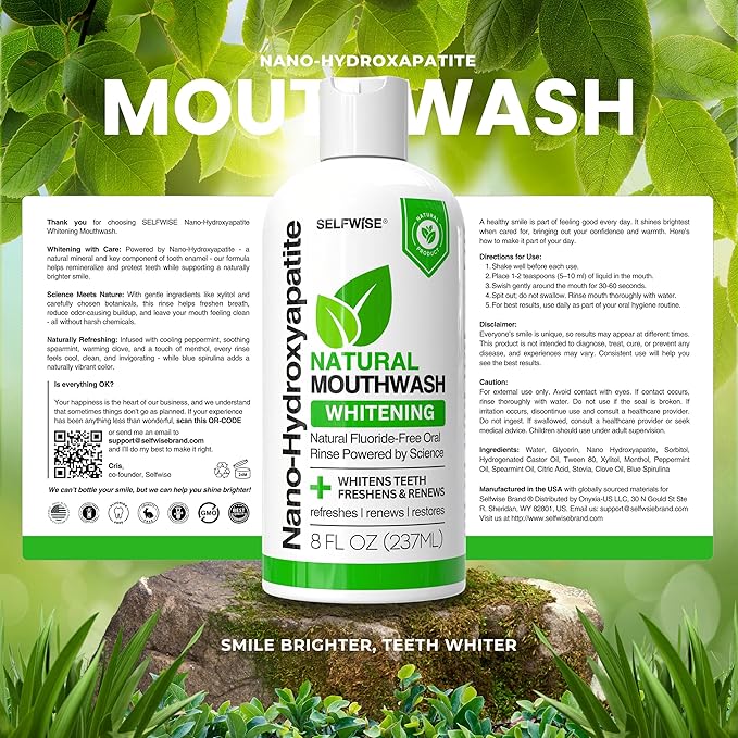 - NATURAL MOUTHWASH WITH NANO HYDROXYAPATITE – Harnesses the power of this natural mineral, a key component of tooth enamel, to help support enamel protection while promoting safe whitening.