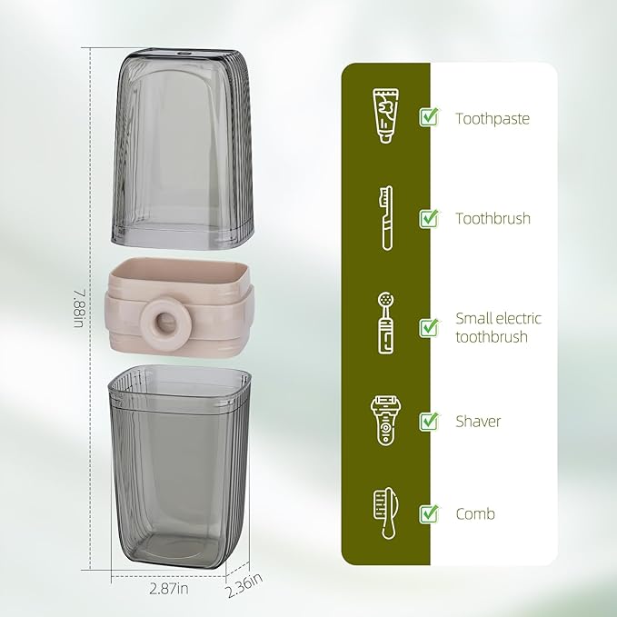 - Product Design: This premium travel toothbrush case is made of durable plastic with exceptional pressure resistance. The case consists of three detachable sections (top, middle, and bottom) that can be separated into two rinse cups. When assembled, it functions as a travel toiletry bag.