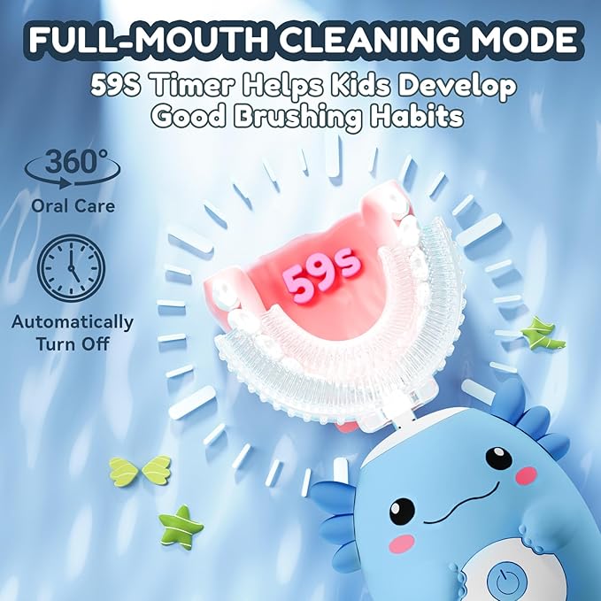 - 59 Second Timer : The kids electric toothbrush is easy to use, making it the perfect choice for parents who want to get their child's teeth clean and efficiently.This u-shaped electric toothbrush is with 45 second timer, which will automatically shut down
