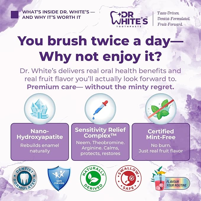 - ✅ A BOLD BURST OF PASSION IN EVERY BRUSH — SWEET, TART, UNFORGETTABLE. Passion Fruit Kiss delivers bold, tropical flavor in a fluoride-free, sensitivity-soothing formula. Powered by nano-hydroxyapatite (nHA) and Dr. White’s Sensitivity Relief Complex, it’s mint-free, science-forward, and surprisingly sexy for a toothpaste.