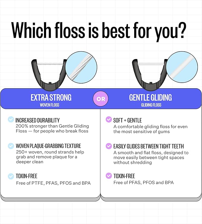 - NEW DURABLE WOVEN FLOSS - Made with 250+ microfibers, our New woven floss delivers 200% more strength — ideal for break-prone flossers. Its rounded, woven texture helps grab onto and remove plaque build up and debris, all without PFAS, PTFE, or other harmful toxins.
