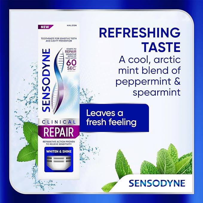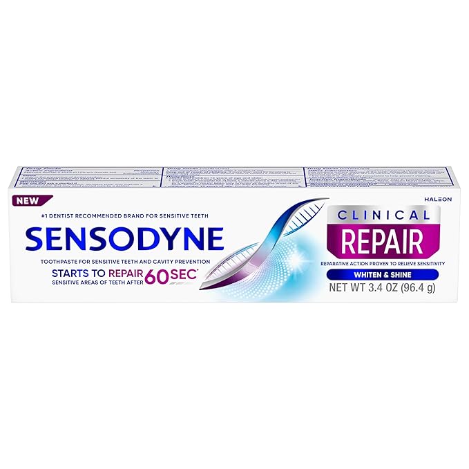 - Three 3.4 oz tubes of Sensodyne Clinical Repair Toothpaste, Whiten & Shine