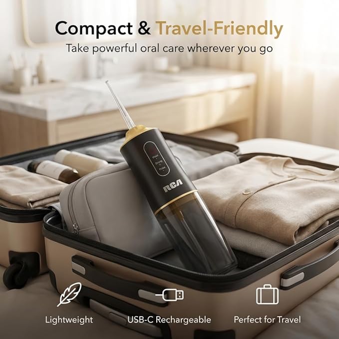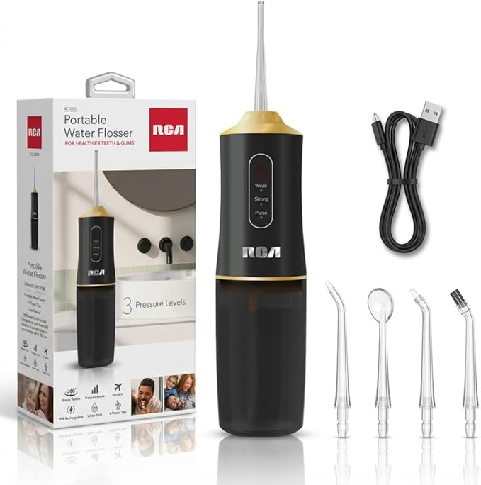 RCA Portable Water Flosser for Teeth & Gums β Cordless Rechargeable Oral Irrigator with 3 Pressure Levels, 4 Jet Tips & USB Tank β Travel Water Flosser for Teeth Cleaning (Black)