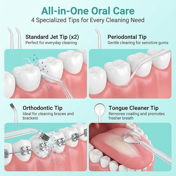 - π 360Β° ROTARY NOZZLE & MULTIPLE TIPS β Easily target every area of your mouth. The rotating tip design ensures thorough cleaning around crowns, bridges, and orthodontics β more effective than traditional floss or water picks for teeth cleaning and flossing.