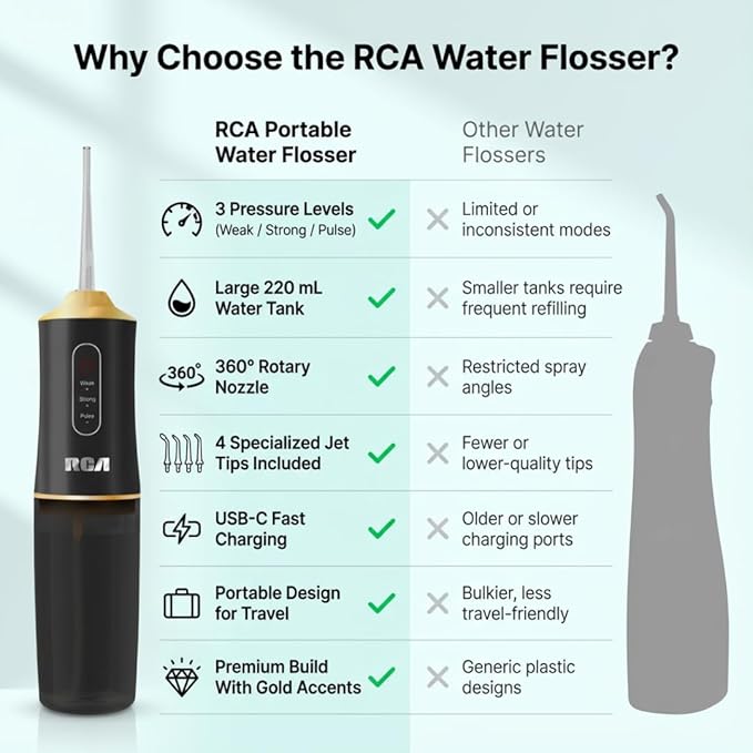 - π§ POWERFUL WATER FLOSSING ACTION β Experience a deep clean that reaches where brushing canβt. The RCA Water Flosser removes plaque, debris between teeth and along the gumline for a dentist-fresh feel every day.