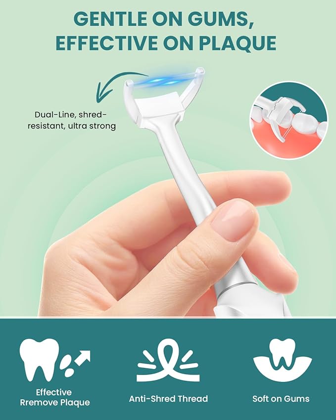 - DOUBLE-LINE FLOSS - TOUGH YET GENTLE - Our electric flosser pick showcases a double - strand design, meticulously crafted to resist stretching, shredding, or breaking. This design is perfect for efficiently eliminating plaque, all while being gentle on sensitive gums. Each flossing session transforms into a pleasant experience, leaving your smile in prime condition. Bid farewell to the inconvenience and harshness of traditional flossing.