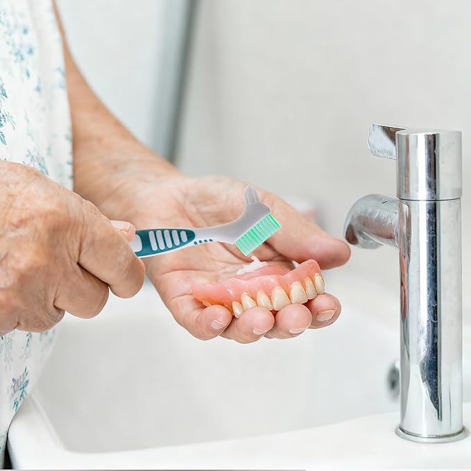 - 【Dual-Head for Thorough Cleaning】Featuring an innovative dual-head design, the large brush tackles surface debris while the small pointed tip accesses hard-to-reach crevices, leaving no area unclean for comprehensive denture care.