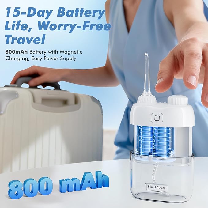 - Long-Lasting Battery & Effortless Charging: Enjoy up to 15 days of cordless use on a single charge. The combination of magnetic wireless charging and an IPX7 waterproof rating makes powering up simple and safe. It's the perfect travel water flosser—powerful enough for extended trips without the need for extra cables, truly freeing you from battery anxiety.