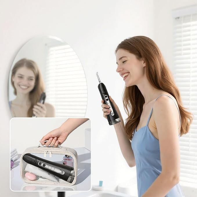- 40 DAYS LONG BATTERY LIFE & PORTABLE TRAVEL DENTAL KIT - The rechargeable electric water flosser is portable and compact, ideal for business trips or vacations. In WEAK mode, it runs up to 40 days of use on a single 4-hour charge, eliminating the need for frequent recharging. With a 2-minute auto shutoff function, it ensures optimal performance while thoroughly cleaning your teeth and gums, saving power and keeping your oral care comfortable yet efficient.