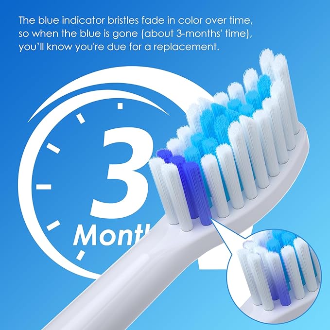 - [Indicator Bristles]:The color on the tip of the bristles fades over time, signaling when to replace your sonic toothbrush head.It's best to replace it every three months.
