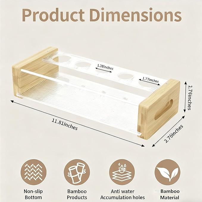 - 【Compact & Hygienic 2-Tier Bamboo Organizer】 This bamboo toothbrush holder is designed for hygiene and space-saving. Measuring just 11.81” L x 3.76” W x 2.76” H, it keeps family toothbrushes separated in dedicated upper-tier slots (two 1.77” and three 1.38” holes) to prevent germy head-to-head contact. Its smart design is perfect for any bathroom countertop organizer.