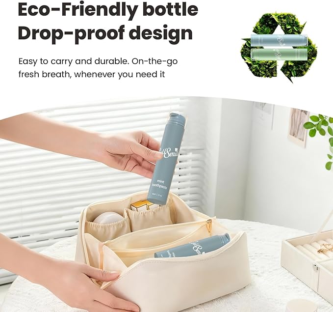 - Travel-Friendly and Earth-Conscious: Our toothpaste features a leak-proof, durable bottle in a perfectly portable size. Lightweight, drop-proof, and eco-friendly, it’s designed for the active life of frequent travelers, campers, and students. Take it anywhere and enjoy fresh breath without ever compromising on convenience or your commitment to sustainability