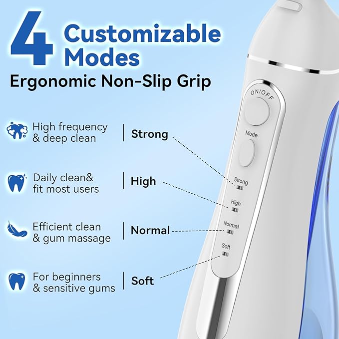 - 【4 Adjustable Pressure Modes & Easy Operation】With 4 customizable water pressure levels, this oral irrigator adapts to different needs—gentle mode for sensitive gums or first-time users, and high-pressure mode for deep cleaning. The ergonomic non-slip handle ensures comfort and control, while the easy-attach tip system allows quick switching between the 5 included nozzles