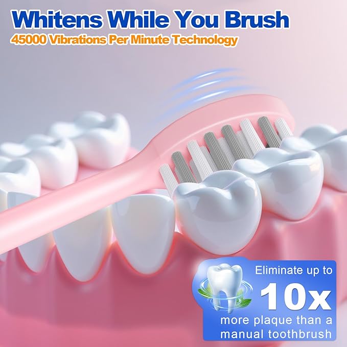 - 【Efficient Deep Cleaning: This rechargeable toothbrush is equipped with a high-quality advanced motor, with a maximum vibration frequency of 42000VPM. Efficiently and deeply clean the surface and gaps of teeth, reducing dental plaque and stains. It is 10 times more efficient than a regular manual toothbrush for cleaning.